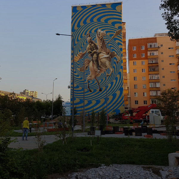 Этот мурал с изображением казахского батыра на коне мы создали в рамках фестиваля URBANFESTASTANA в 2018 году. Хотели показать силу и дух предков, чтобы современный город помнил свои корни.