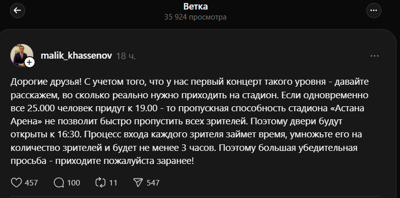 “С учетом того, что у нас первый концерт такого уровня – давайте расскажем, во сколько реально нужно приходить на стадион. Если одновременно все 25 тысяч человек придут к 19:00, то пропускная способность стадиона “Астана Арена” не позволит быстро пропустить всех зрителей. Поэтому двери будут открыты к 16:30. Процесс входа каждого зрителя займет время, умножьте его на количество зрителей и будет не менее трёх часов”, – объяснил Хасенов.