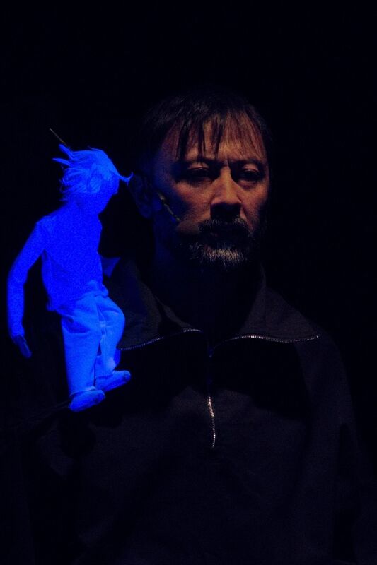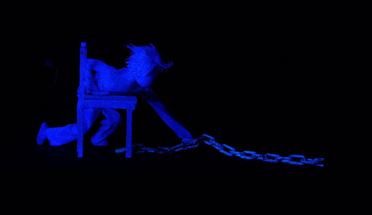 Небольшая платформа в центре сцены подсвечена особой лампой, которая заставляет сиять белую ткань. Все происходит будто в нереальном мире. Только рассказчик, появляющийся ненадолго на сцене, настоящий живой актёр. Все остальные — главный герой, его партнёр — белые фигуры без лиц, без одежды, словно тень человека.