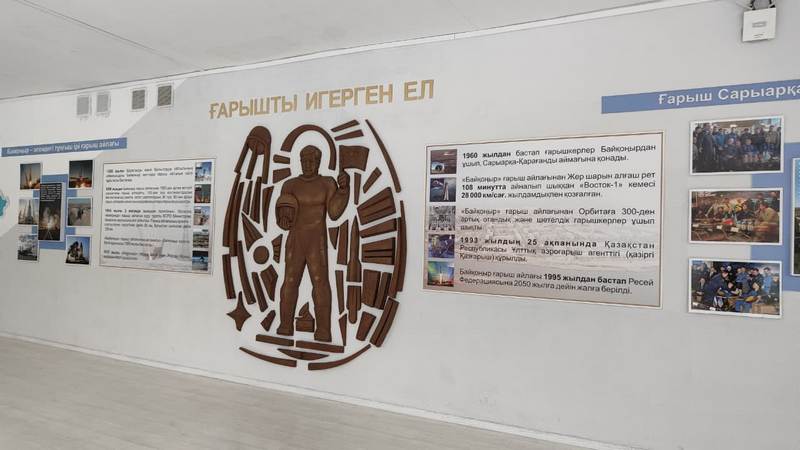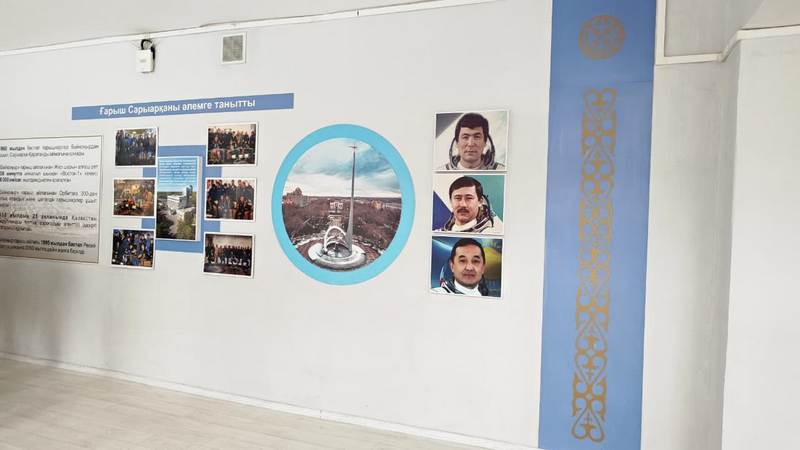 Экспозиция здесь начинается уже в фойе: посетителей встречают барельеф Юрия Гагарина и портреты казахстанских космонавтов Токтара Аубакирова, Талгата Мусабаева, Айдына Аимбетова и других людей, оставивших след в авиации и космосе.