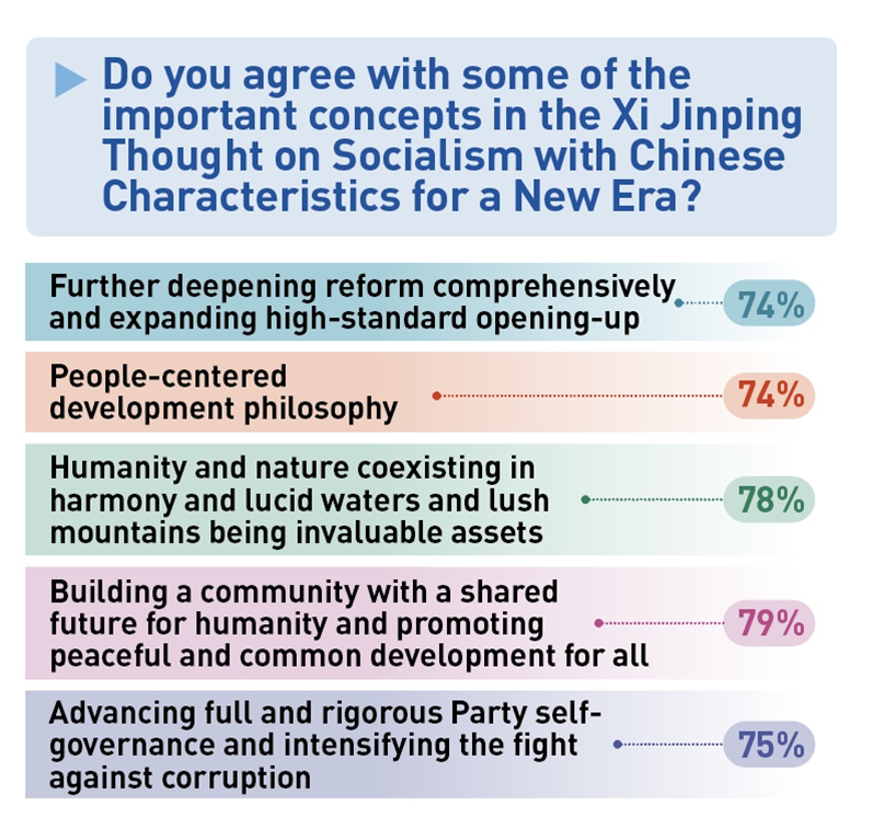 Опрос показал высокий уровень поддержки ключевых концепций Идей Си Цзиньпина о социализме с китайской спецификой новой эпохи. Почти 80% респондентов поддержали такие положения, как: