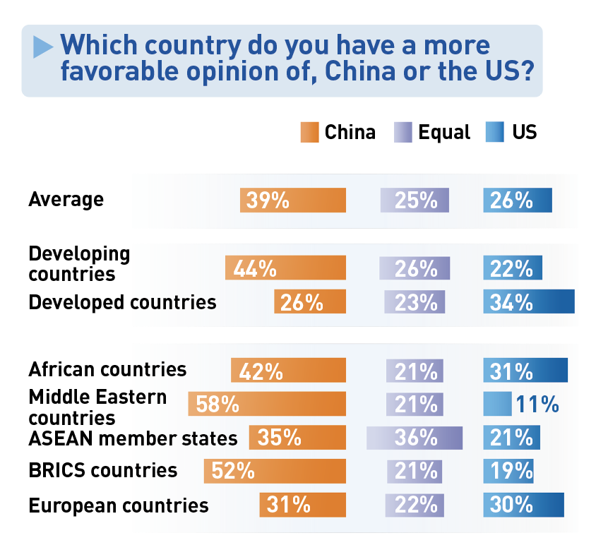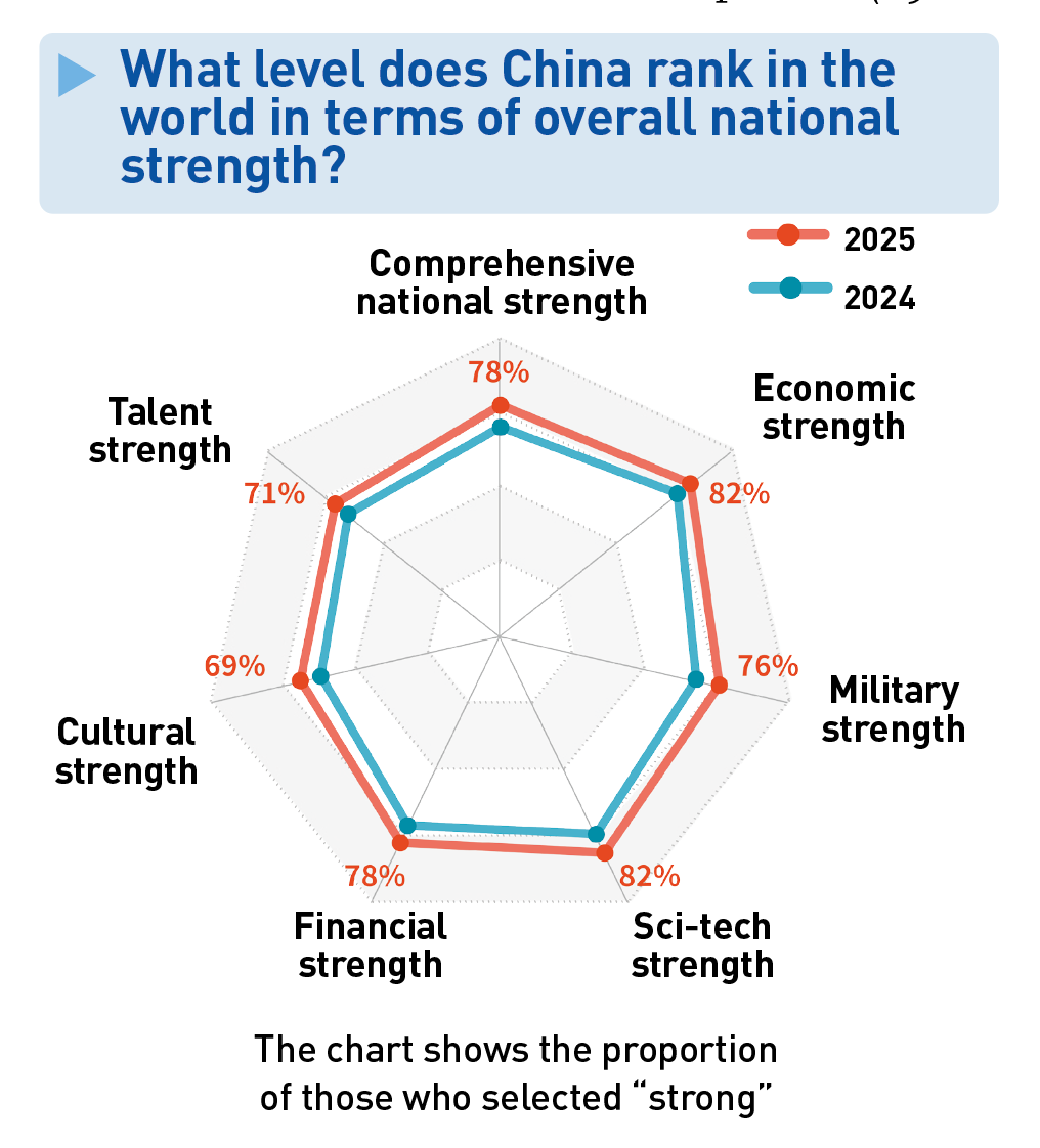 Около 78% считают, что совокупная национальная мощь Китая продолжает расти. В глобальном рейтинге международного влияния Китай в среднем занимает второе место, при этом доля тех, кто ставит Китай на первое место, увеличилась, а позиции США, напротив, ослабли.