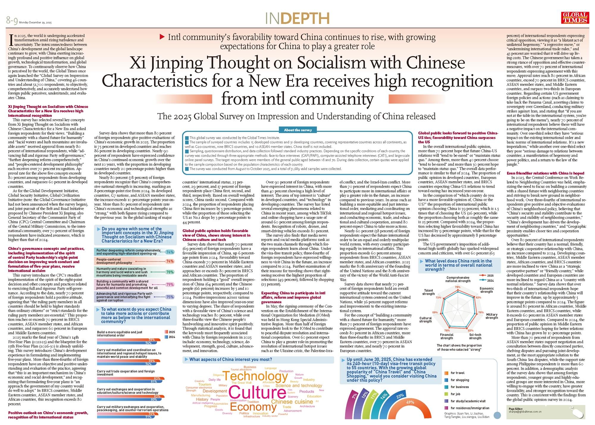 Для объективного и всестороннего понимания того, как Китай воспринимается за рубежом, газета Global Times вновь провела масштабное международное исследование — Global Survey on Impression and Understanding of China. Опрос охватил 46 стран, около 51 700 респондентов и позволил зафиксировать, как иностранная общественность оценивает Китай, его политику, экономику, культуру и международную роль.