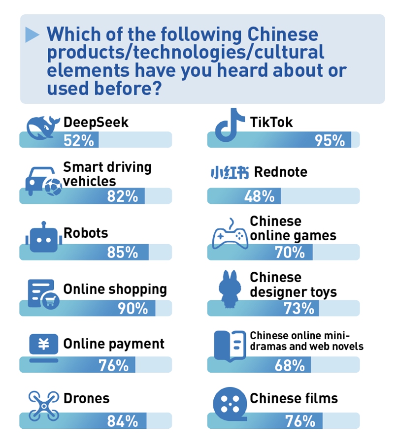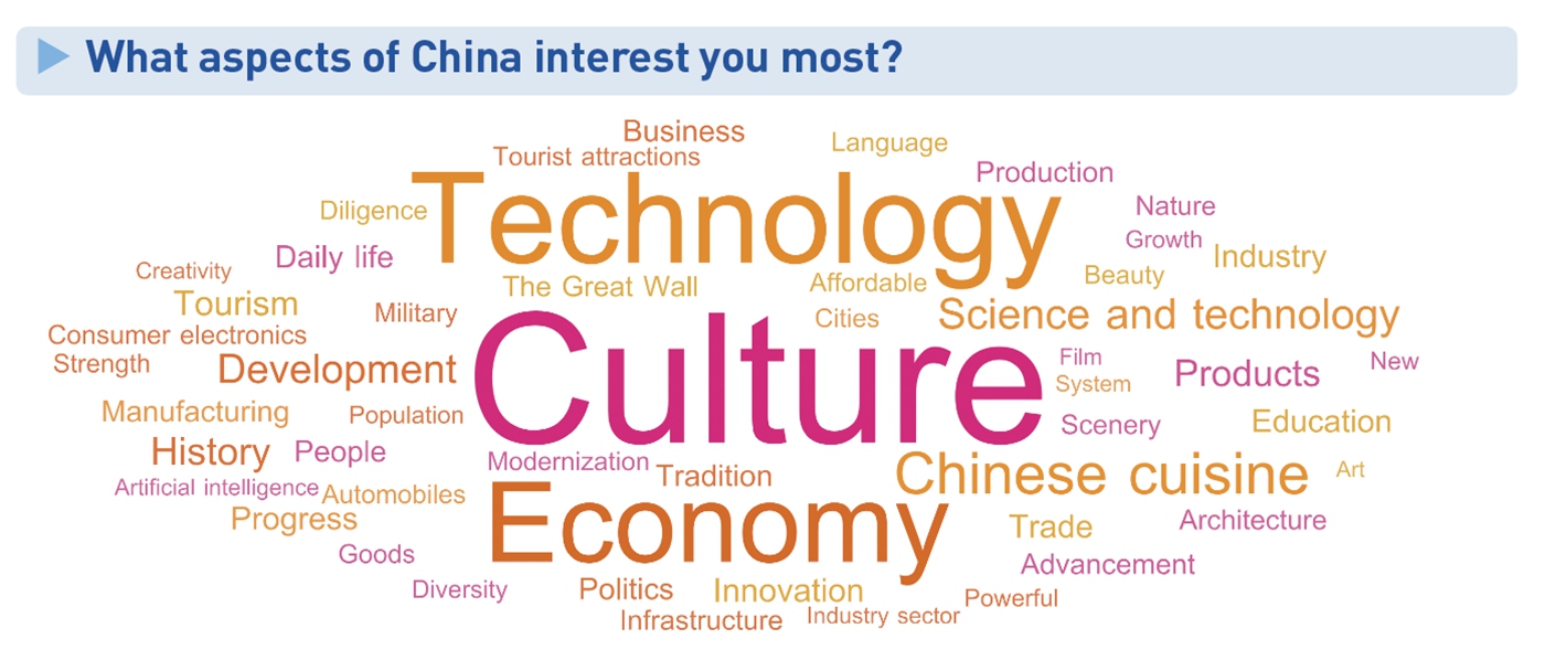 Китай ассоциируется с такими понятиями, как экономика, технологии, развитие, инновации, культура и сила. Более 90% опрошенных заявили об интересе к Китаю, а около 40% — о высоком уровне такого интереса.