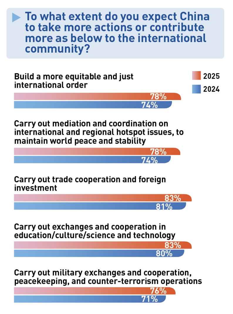 Более 70% респондентов ожидают, что Китай будет играть более активную роль в международных делах, в том числе в урегулировании глобальных кризисов и реформировании мировой системы управления. Поддержка идеи многополярного и справедливого мирового порядка также стабильно растёт.